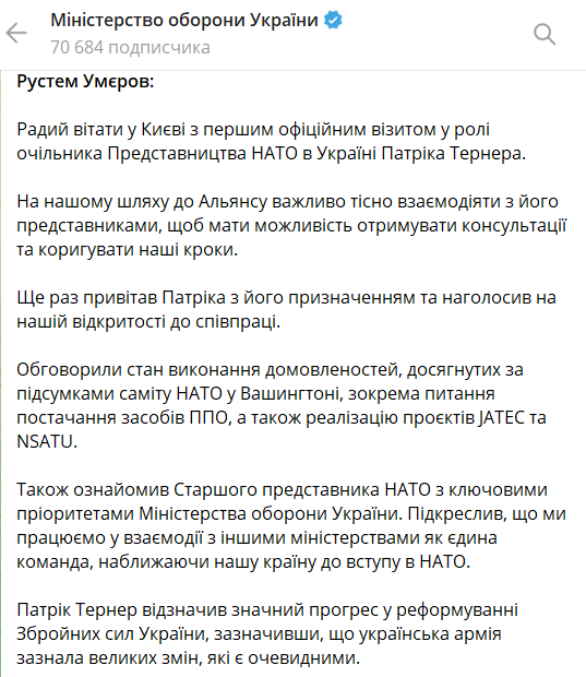 "Обговорили стан виконання домовленостей, досягнутих за підсумками саміту НАТО у Вашингтоні, зокрема, питання постачання коштів ППО, а також реалізацію проектів JATEC та NSATU. Патрік Тернер відзначив значний прогрес у реформуванні Збройних сил України, зазначивши, що українська армія зазнала великих змін, які очевидні. Додатково поінформував колегу про участь військових КНДР у поточній ескалації агресії проти України", - написав Умеров.