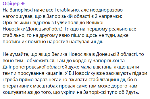 "Потрібно прямо зараз негайно вдаватися до стабілізаційних дій, тому що в оперативних масштабах провал саме там може дорого нам коштувати - аж до того, що укріплення на Запоріжжі тупо обійдуть", - заявляє "Алекс".