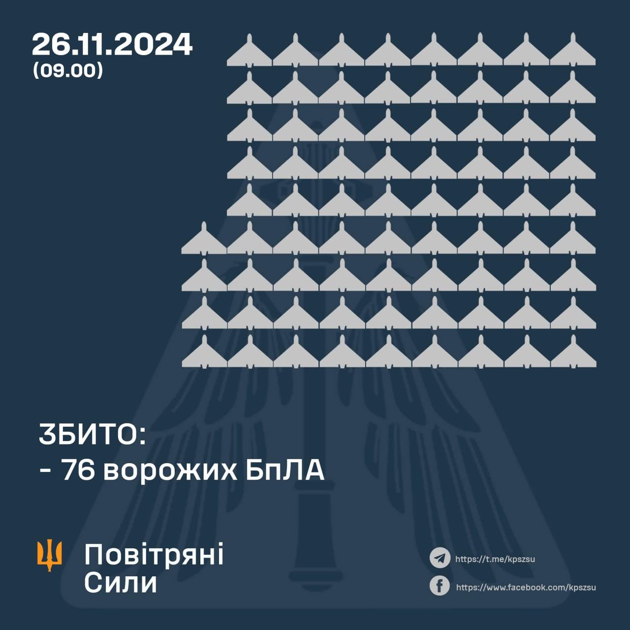 9.15 Повітряні сили повідомляють, що цієї ночі Україною запустили рекордну кількість "Шахедів" - 188. Збити вдалося 76.