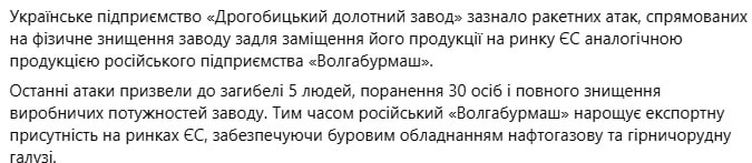 Він зазначив, що останні атаки на долотний завод у Дрогобичі призвели до загибелі 5 та поранення 30 осіб, а також повного знищення виробничих потужностей.