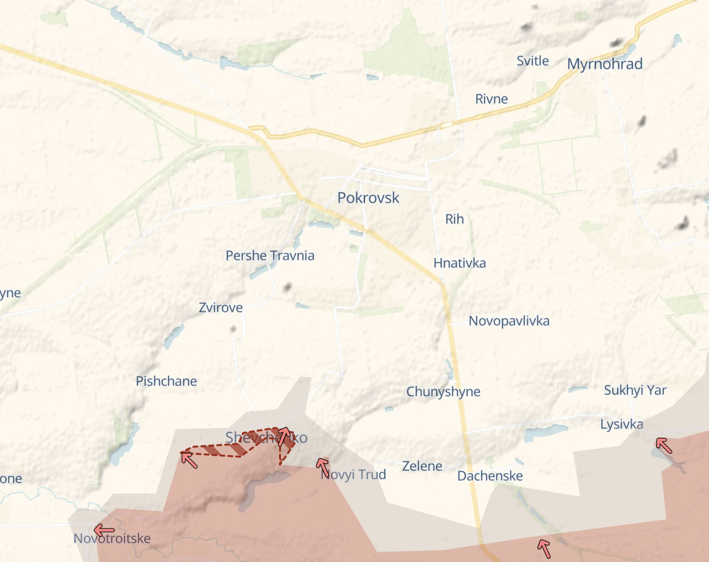 Також росіяни наступають на захід - на село Піщане, до якого їм залишилося менше кілометра. Цей рух, як припускають українські військові, спрямований на наближення до західної околиці Покровська та контроль за трасою, яка веде до міста з боку Дніпропетровської області.