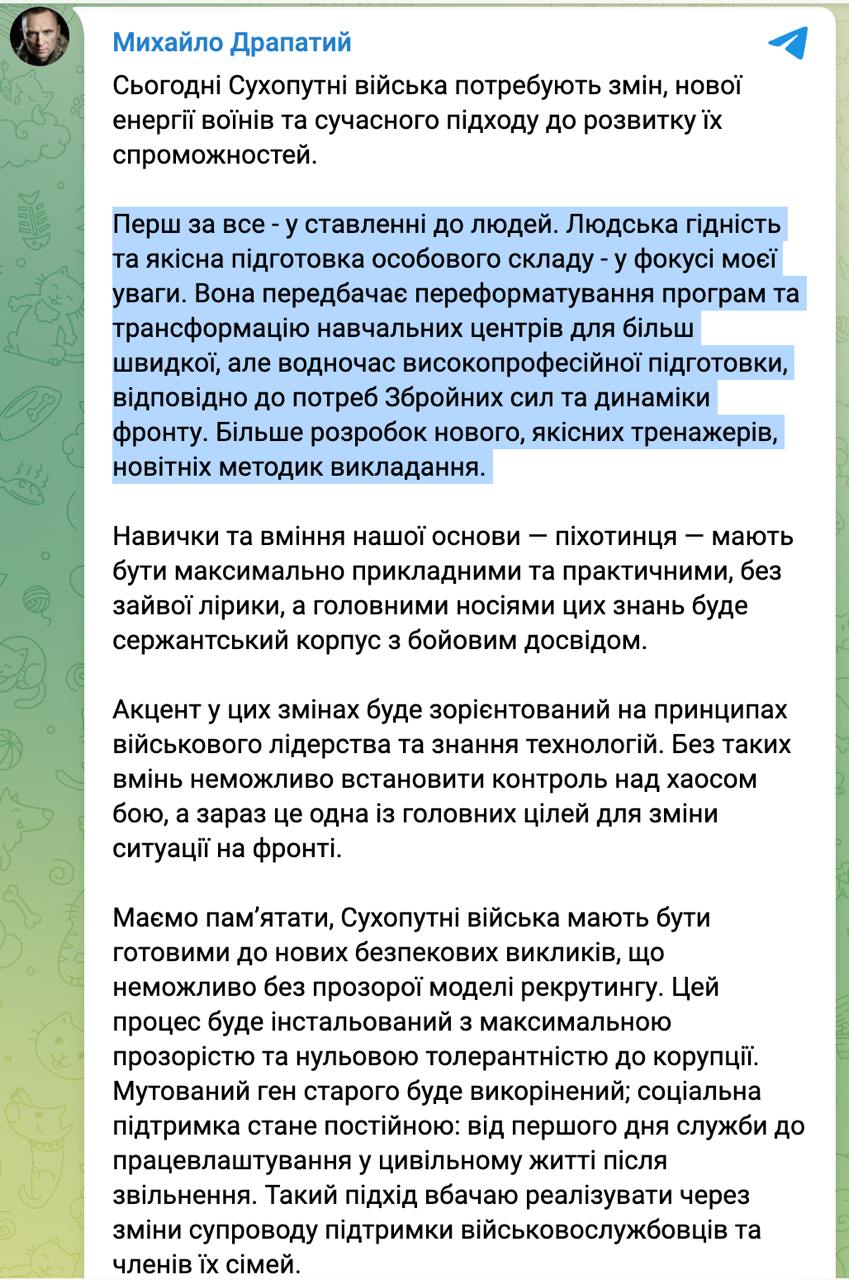 Він анонсував "переформатування програм та трансформацію навчальних центрів для більш швидкої, але водночас високопрофесійної підготовки".