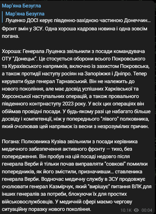 Щодо Луценка, то його українські військові пабліки критикували за розвал управління підрозділами на Курахівському та Покровському напрямках. Заявлялося, що там панував хаос, відсутність координації, а також давалися неправдиві доповіді про стан справ на місцях.