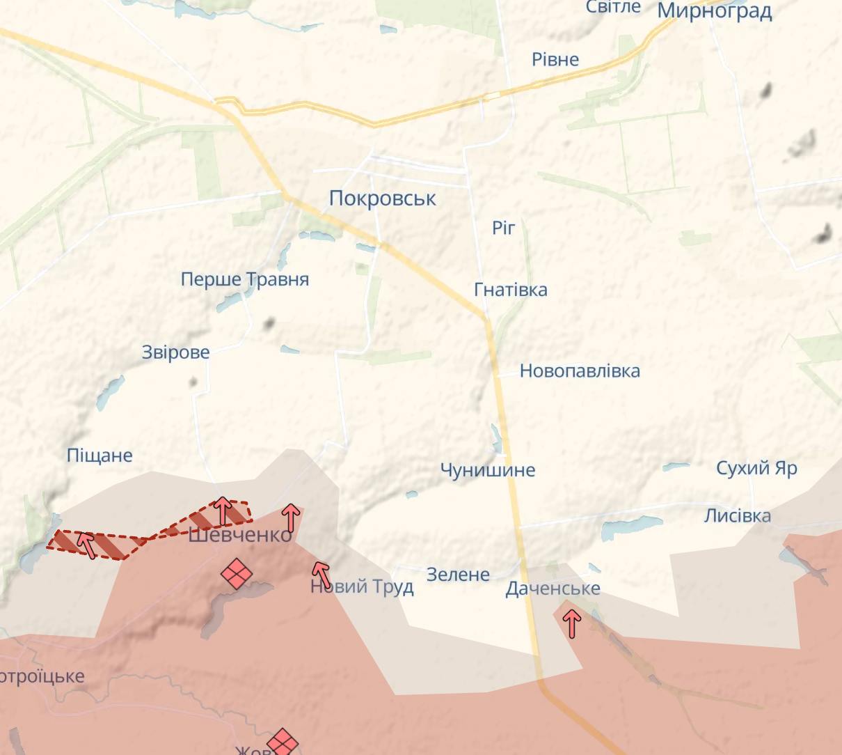 11:36 Росіяни знову просунулися під Покровськом, де напередодні контратакували ЗСУ, свідчить карта Deep State.