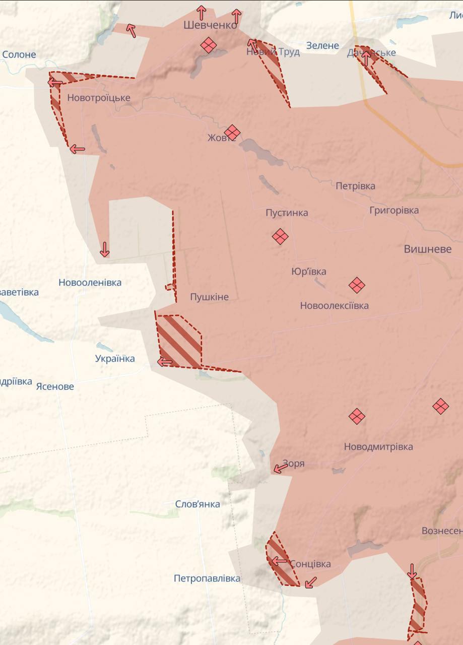 Карта Deep State свідчить, що росіяни захопили Сонцовку на північному фланзі, а на південному зайняли ділянку в полі на північний захід від Зеленівки, приблизно за два кілометри від траси на Курахово.