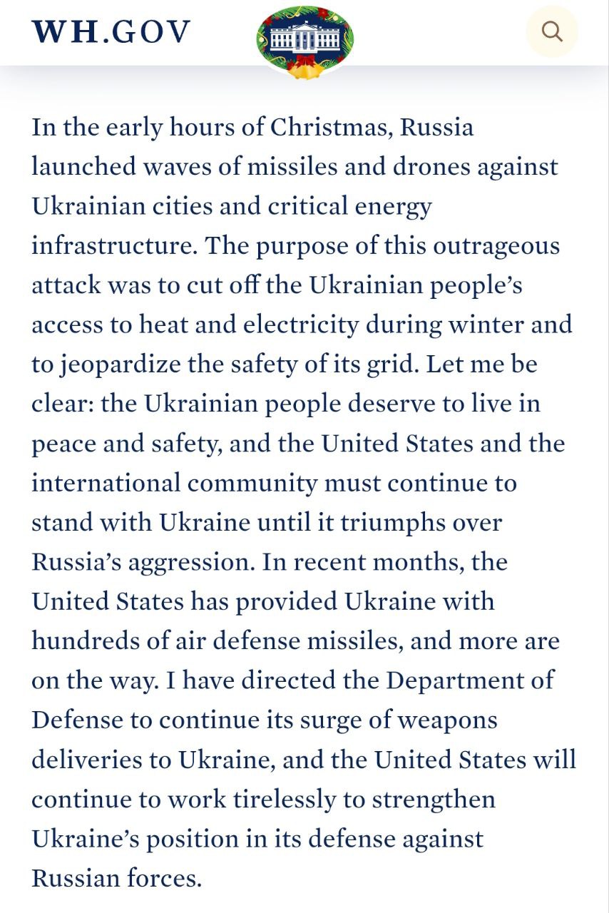 "Метою цієї обурливої атаки було позбавити український народ доступу до тепла та електрики у зимовий період і поставити під загрозу безпеку електромереж", - заявив Байден.
