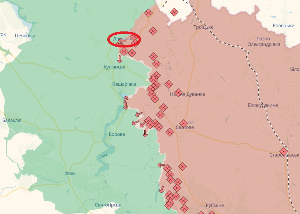 Дворічна – село, яке знаходиться на західному березі Оскола. Біля нього росіяни нещодавно створили плацдарм, намагаючись його розширити. За даними Deep State, частина Дворічної вже зайнята супротивником.