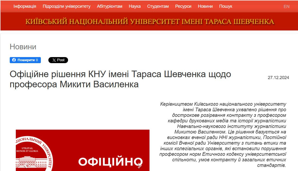 Нагадаємо, студпарламент Навчально-наукового інституту журналістики КНУ імені Тараса Шевченка заявив, що відмовляється від співпраці з адміністрацією інституту, доки Василенка не буде звільнено.