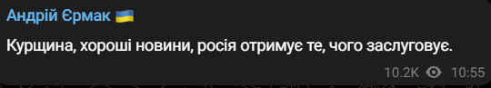 "Курщина, хороші новини, росія отримує те, на що заслуговує", - написав Єрмак.