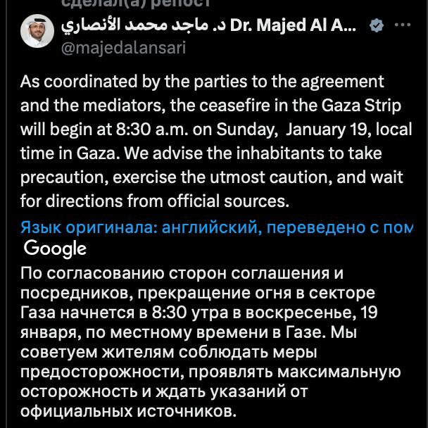 У свою чергу уряд Ізраїлю затвердив угоду з ХАМАС про припинення вогню та обмін полоненими та звільнення заручників. Раніше повідомляли, що перших заручників відпустять вранці в неділю.