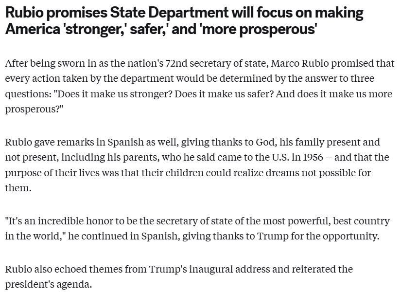20.30 "Припинення війни в Україні стане офіційною політикою США. І ми не хочемо, щоб вона відновилася": ще одна заява держсекретаря Марко Рубіо у програмі "Доброго ранку, Америка" на телеканалі АВС.