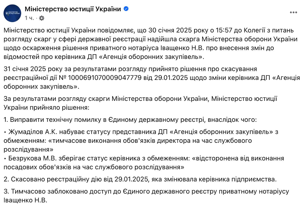 Мін'юст також скасував реєстраційну дію від 29 січня, яка змінювала керівника підприємства. А приватному нотаріусу, який це зробив, тимчасово заблокували доступ до Єдиного держреєстру.