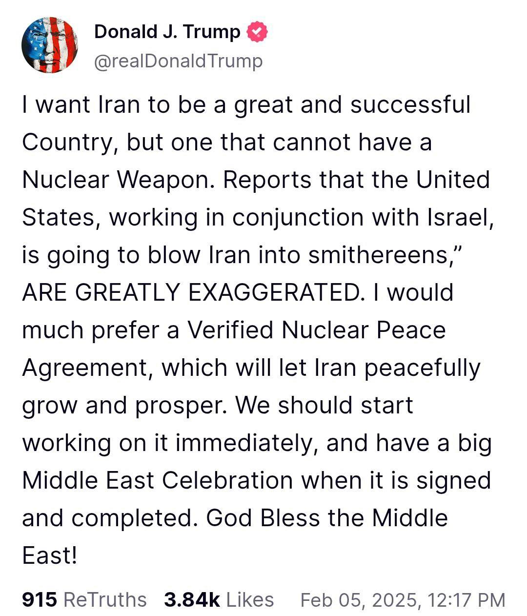 "Я б віддав перевагу верифікованій ядерній мирній угоді, яка дозволить Ірану мирно рости і процвітати. Ми повинні почати працювати над нею негайно і влаштувати велике близькосхідне свято, коли воно буде підписано і завершено", - сказано в публікації.
