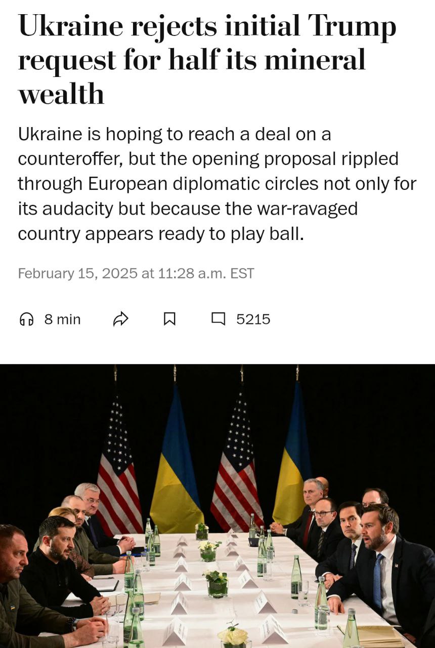 "Високопоставлений український чиновник був приголомшений масштабом вимог адміністрації Трампа. Він порівняв це з тим, як європейці ділили африканські колонії у XVIII столітті, і зазначив, що це також може призвести до того, що право на розробку українських ресурсів буде передано на десятиліття без будь-яких гарантій, що інвестори дійсно займуться".