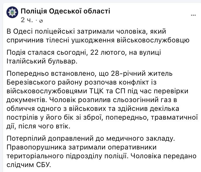 "Чоловік розпорошив сльозогінний газ в обличчя одного з військових і зробив кілька пострілів у його бік зі зброї, попередньо травматичної дії, після чого втік. Потерпілого доставлено до медичного закладу. Правопорушника затримали", - заявили в поліції.
