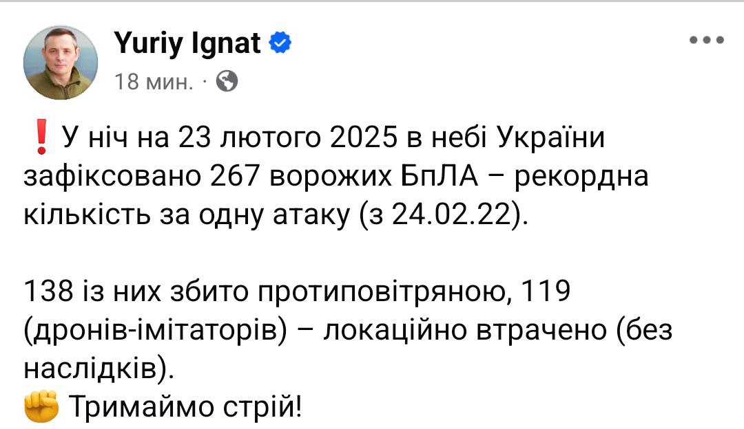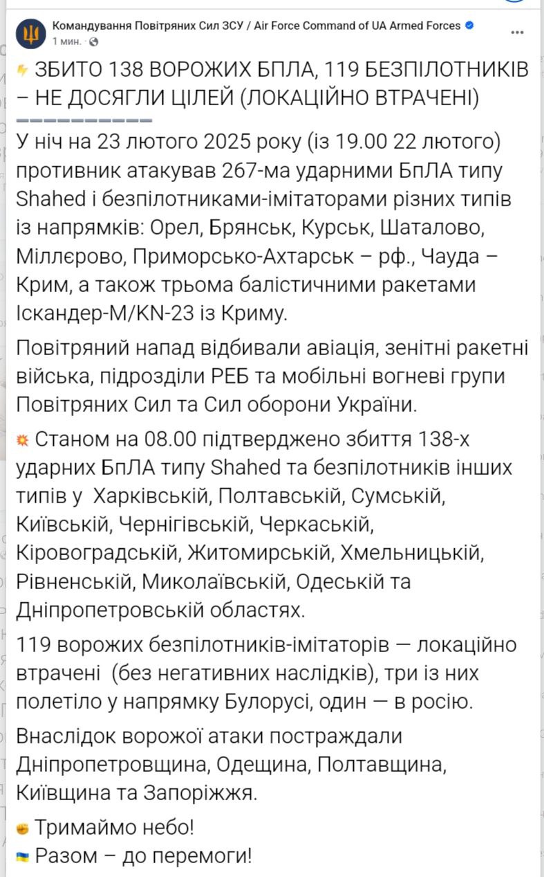Вночі Україну атакували одразу 267 безпілотників різних типів. 138 із них збили, а 119 "локаційно втрачено".