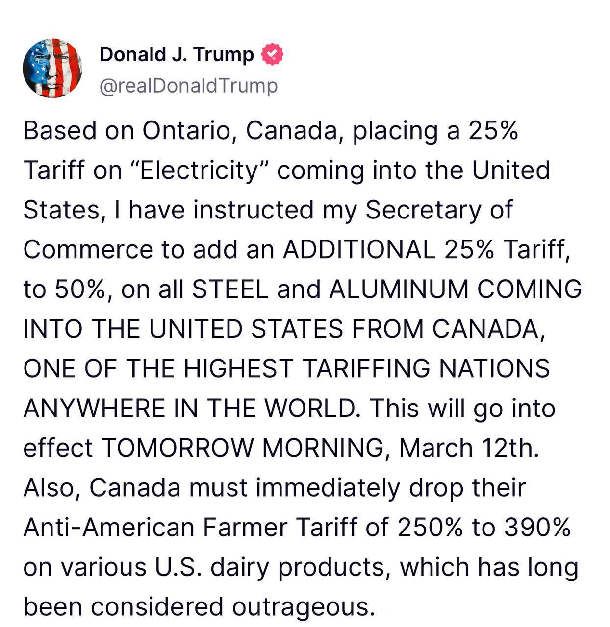 "На основании установлением Онтарио, Канада, 25го тарифа на электричество, поступающее в США, я поручил своему министру торговли добавить дополнительный 25%-ный тариф, до 50%, на всю сталь и алюминий, поставляемые в Соединенные Штаты из Канады, одной из стран с самыми высокими тарифами в мире. Это вступит в силу завтра утром, 12 марта. Кроме того, Канада должна немедленно отменить свой антиамериканский фермерский тариф в размере 250-390% на различные молочные продукты США, что долгое время считалось возмутительным. Я вскоре объявлю чрезвычайное положение в отношении электроэнергии. Это позволит США быстро сделать то, что необходимо, чтобы смягчить эту оскорбительную угрозу со стороны Канады. Если другие вопиющие долгосрочные пошлины не будут также отменены Канадой, я существенно увеличу 2 апреля пошлины на автомобили, ввозимые в США, что по сути навсегда закроет автомобильный бизнес в Канаде. Эти автомобили можно легко производить в США! Кроме того, Канада платит очень мало за национальную безопасность, полагаясь на военную захист Сполучених Штатів. Ми субсидуємо Канаду на суму понад 200 мільярдів доларів на рік. Чому? Так не може тривати. Єдине, що має сенс, — щоб Канада стала нашим заповітним п'ятдесят першим штатом. Це змусило б усі мита та все інше повністю зникнути. Податки канадців будуть суттєво знижені, вони будуть більш безпечними у військовому та іншому відношенні, ніж будь-коли раніше, більше не буде проблеми північного кордону, і найбільша і наймогутніша країна у світі стане більше, краще і сильніше, ніж будь-коли — і Канада відіграватиме велику роль у цьому. Штучна лінія поділу, проведена багато років тому, нарешті зникне, і у нас буде найбезпечніша та найкрасивіша країна у світі. І ваш блискучий гімн "О, Канада" продовжуватиме звучати, але тепер він представлятиме велику і потужну державу у складі найбільшої країни, яку будь-коли бачив світ!" - написав Трамп.