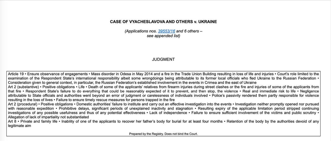 Європейський суд з прав людини (ЄСПЛ) зобов'язав Україну виплатити компенсації жертвам трагедії 2 травня 2014 року в Одесі, під час якої сталася пожежа у Будинку профспілок.