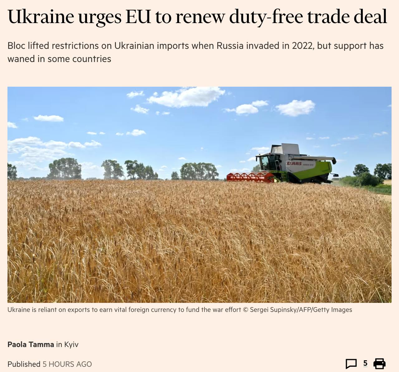 Про це пише Financial Times, нагадуючи, що наближається закінчення терміну дії пільгового доступу українських товарів без квот та мит на ринок Євросоюзу.
