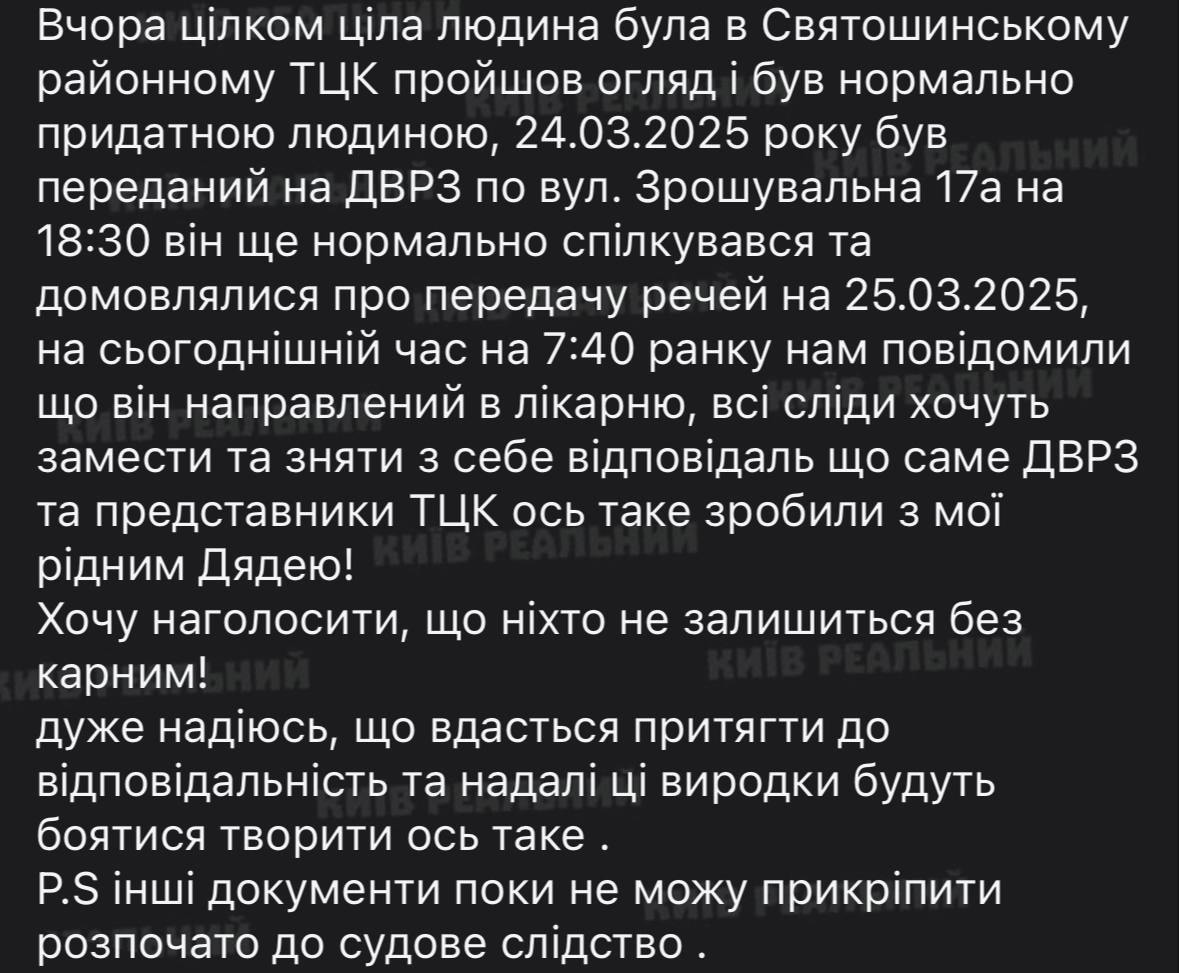 Молода жінка опублікувала повідомлення в соцмережах про те, що її дядька побили у збірному пункті на ДВРЗ після медогляду, після чого відправили до лікарні.