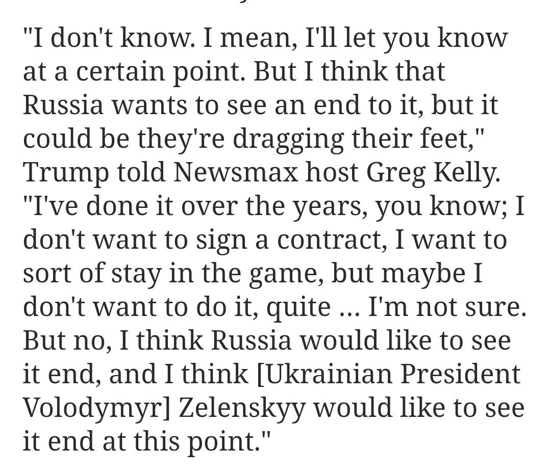 "Думаю, Росія хоче, щоб це закінчилося, хоча, можливо, вони тягнуть час. Я чинив так протягом багатьох років, чи знаєте; я не хочу підписувати контракт, я хочу як би залишатися в грі, але, можливо, я не хочу цього робити… Я не впевнений.