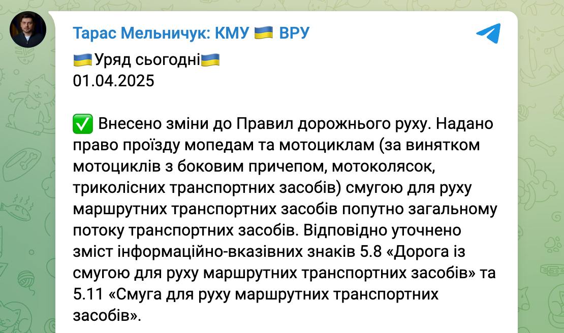 "Внесено зміни до правил дорожнього руху. Надано право проїзду мопедам та мотоциклам (за винятком мотоциклів з боковим причепом, мотоколясок, триколісних транспортних засобів) смугою для руху маршрутних транспортних засобів попутно загальному потоку транспортних засобів. Відповідно уточнено зміст інформаційно-вказівних знаків 5.8 «Дорога із смугою для руху маршрутних транспортних засобів» та 5.11 «Смуга для руху маршрутних транспортних засобів»", - написав Мельничук.