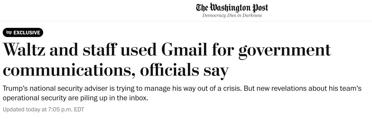 Радник президента США з національної безпеки Майкл Уолтц потрапив у новий скандал, пов'язаний із конфіденційністю даних. Він та члени Ради національної безпеки США обговорювали державні справи через особисті облікові записи електронної пошти Gmail.