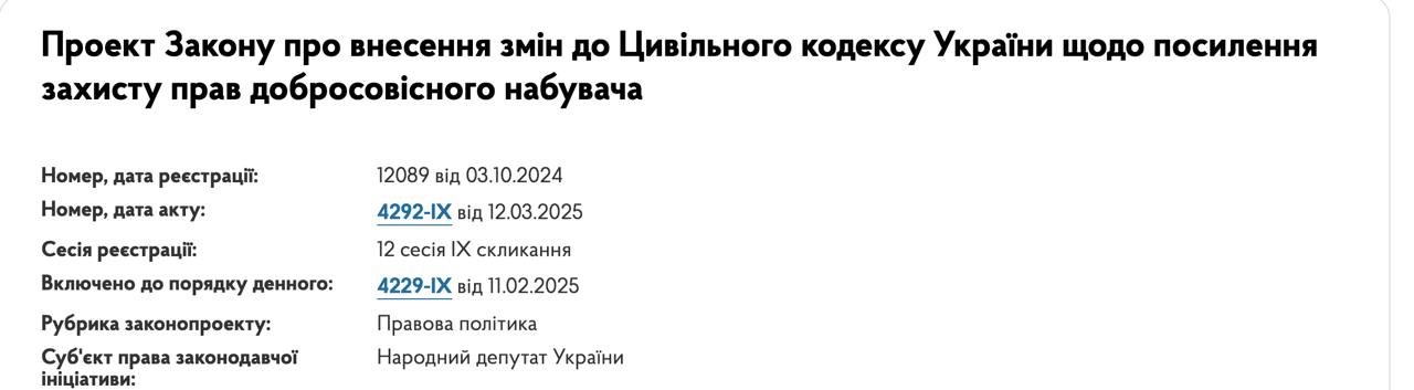 У Верховній Раді вважають, що закон захищає права та інтереси сумлінного набувача у разі вибуття майна з власності держави чи територіальної громади та вирішує питання компенсації при витребуванні майна на користь держави чи громади.