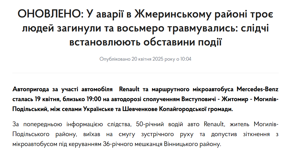 У Вінницькій області сталася ДТП за участю автомобіля Renault і маршрутного мікроавтобуса Mercedes-Benz, внаслідок чого загинули троє людей, ще багато отримали поранення.