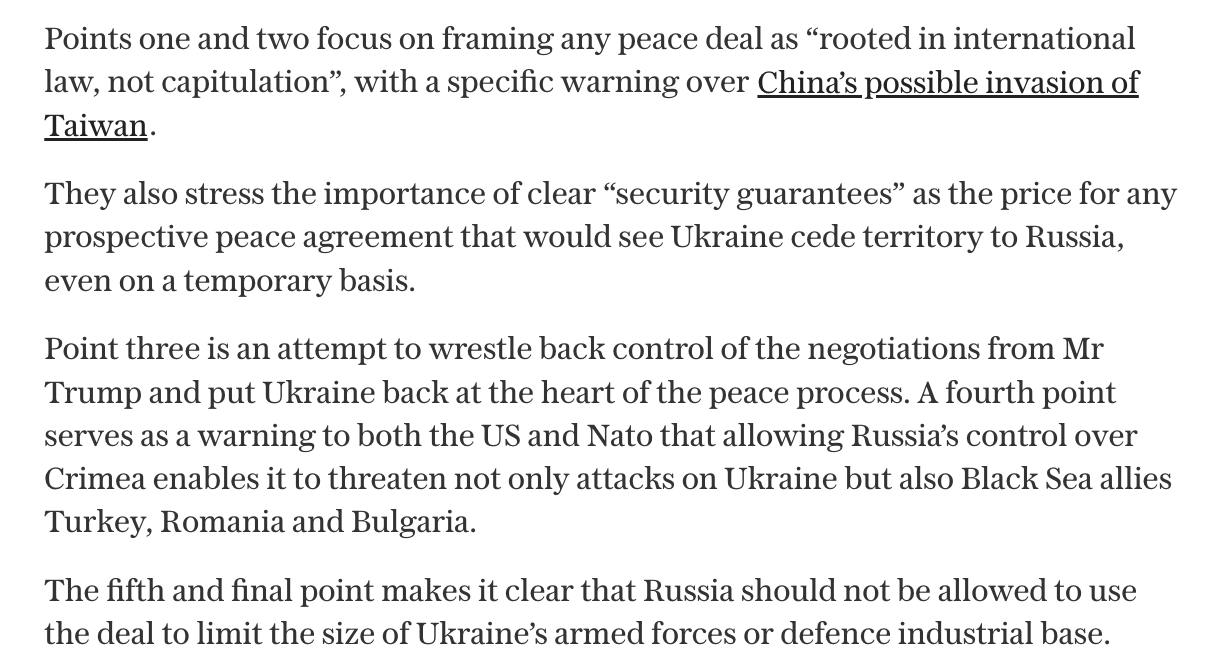 "Третій пункт - це спроба вирвати контроль над переговорами у Трампа і повернути Україну в центр мирного процесу. Четвертий пункт служить попередженням як для США, так і для НАТО, що надання Росії контролю над Кримом дозволяє їй загрожувати атаками не тільки на Україну, але і на союзників по Чорному морю Туреччини, Румунії і Болгарії. використовувати угоду для обмеження розміру збройних сил чи оборонно-промислової бази України", - йдеться у матеріалі.