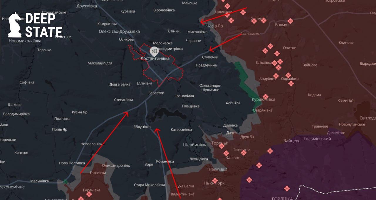 Він також заявляє про критичну важливість утримання висот у Часовому Яру та Ступочек (в яких вже йдуть бої), оскільки за їхньої втрати росіяни зможуть поставити під вогневий контроль всю Костянтинівську агломерацію, "через яку проходить значна частина логістики Сил Оборони".