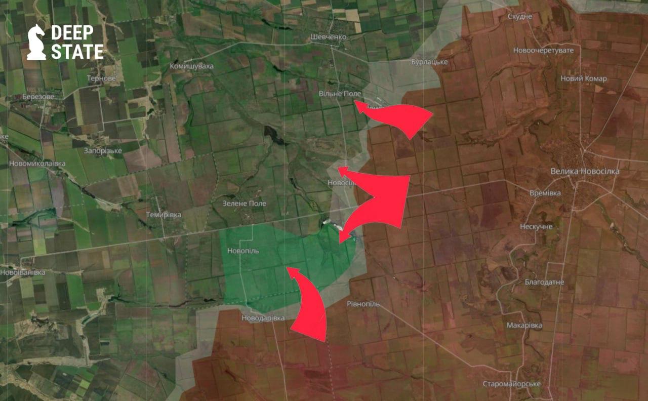 Як повідомляє український військовий паблік Deep State, 3 травня РФ розпочала активні штурмові дії одразу на трьох дільницях: на Вільному Полі, на Зеленому Полі та на південь від Новосілки, а також у напрямку Новополя.