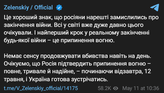 "Це хороший знак, що росіяни нарешті задумалися про закінчення війни. Усі у світі вже дуже давно чекали на це. Немає сенсу продовжувати вбивства навіть на день. Очікуємо, що Росія підтвердить припинення вогню - повне, тривале і надійне - починаючи з завтрашнього дня, 12 травня, і Україна готова зустрічатися", - заявив Зеленський.