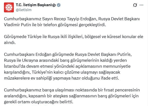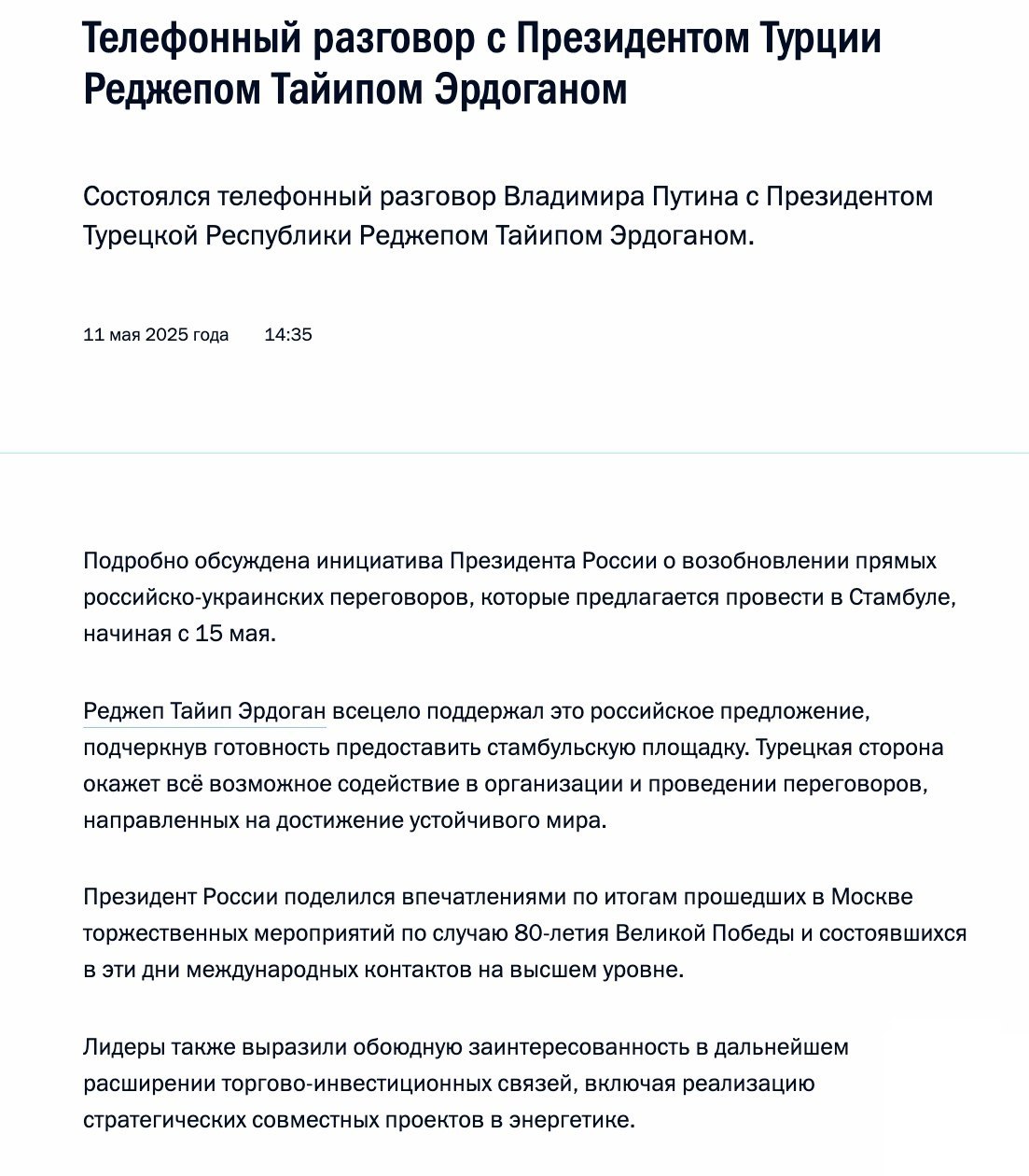 У повідомленні йдеться, що у розмові «докладно обговорено ініціативу президента Росії щодо відновлення прямих російсько-українських переговорів, які пропонується провести у Стамбулі, починаючи з 15 травня».