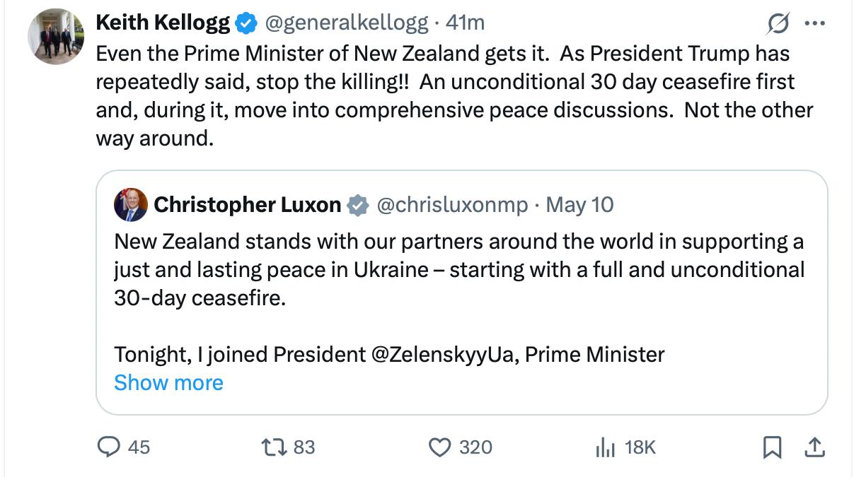 "Як неодноразово говорив президент Трамп, припиніть вбивати! Спочатку беззастережне 30-денне припинення вогню, а протягом цього часу перейти до всеосяжних мирних переговорів. А не навпаки", - написав він у Х.