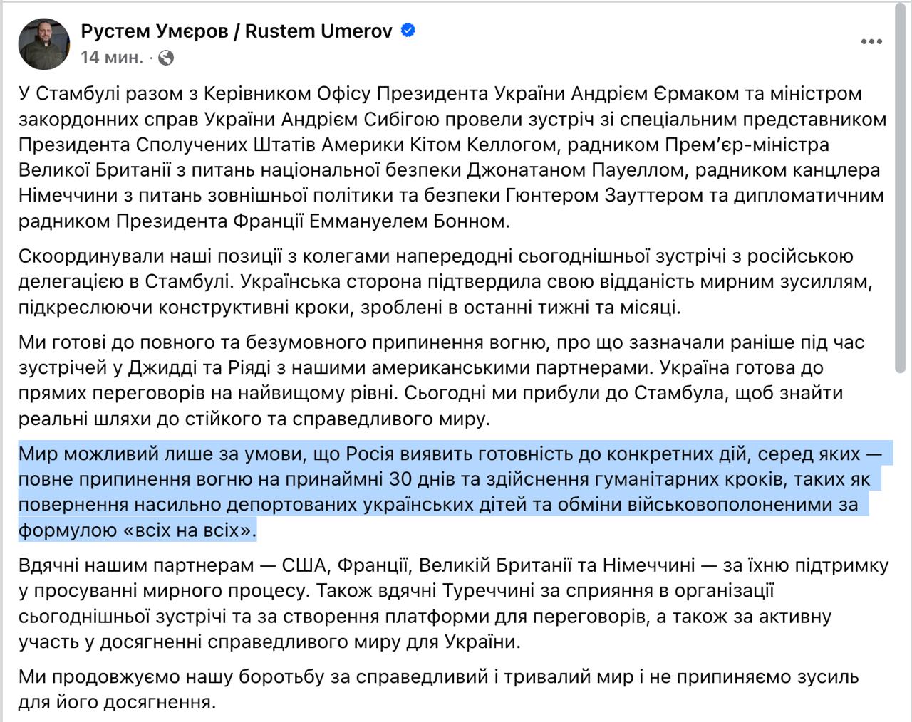 12:49 Глава української делегації міністр оборони Рустем Умеров напередодні переговорів із РФ заявив, що світ можливий лише за згодою РФ на 30-денне перемир'я.