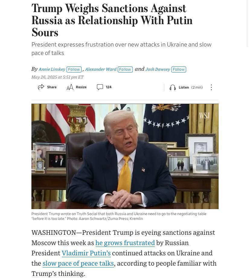 7.13 Президент США Дональд Трамп "приглядається до введення санкцій проти Москви на цьому тижні", оскільки він засмучується через атаки РФ по Україні, що продовжуються, і повільні темпи мирних переговорів, пише The Wall Street Journal з посиланням на людей, "знайомих з думками Трампа".