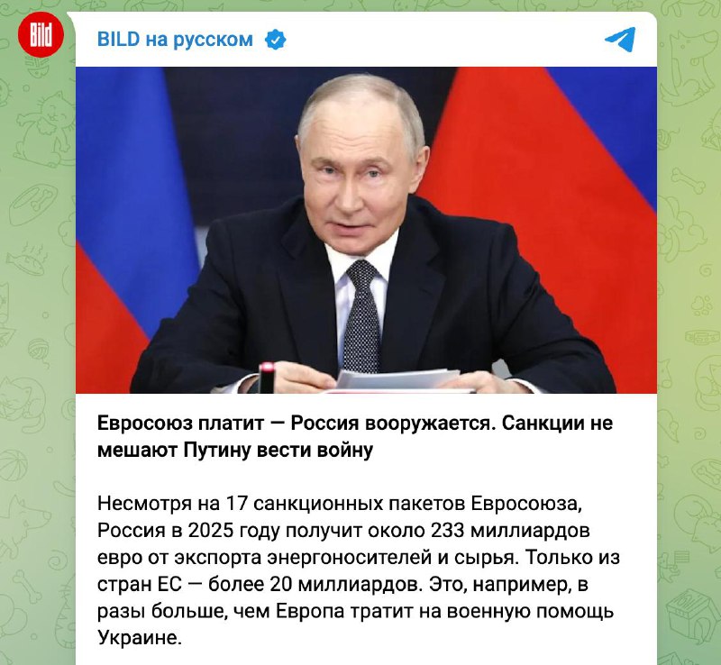 2025 року Європейський Союз заплатить Росії за енергоносії та сировину 20 мільярдів євро. Це в рази більше, ніж виділені кошти на військову допомогу Україні.