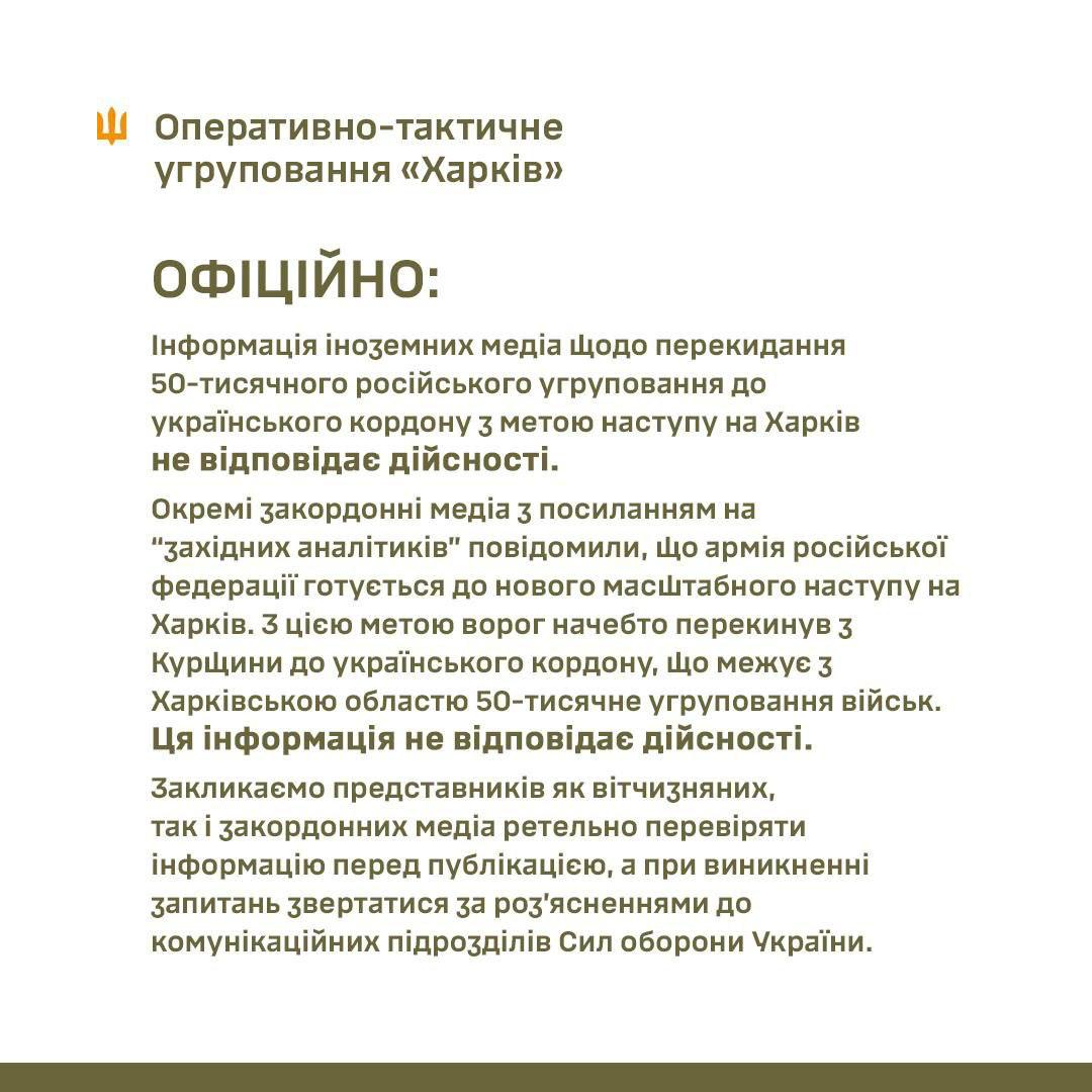 При цьому з публікації ЗСУ не зрозуміло, чи спростовують вони сам факт стягування Росією великого угруповання на кордоні з Харківською областю.
