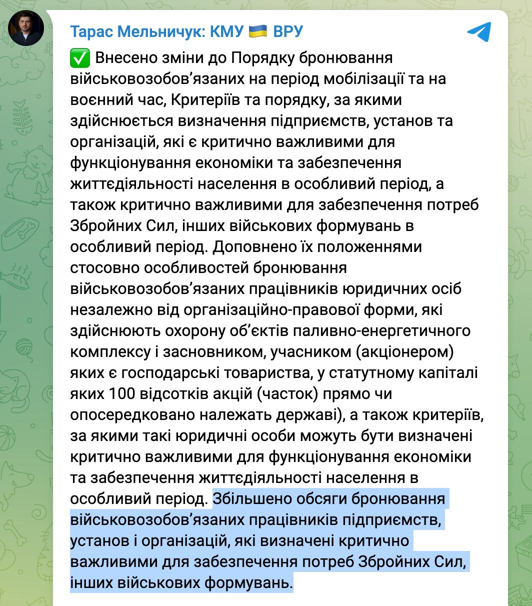 15:45 Підприємства, які є критичними для роботи ЗСУ, тепер зможуть бронювати до 100% працівників, уточнює Мінекономіки рішення Кабміну.