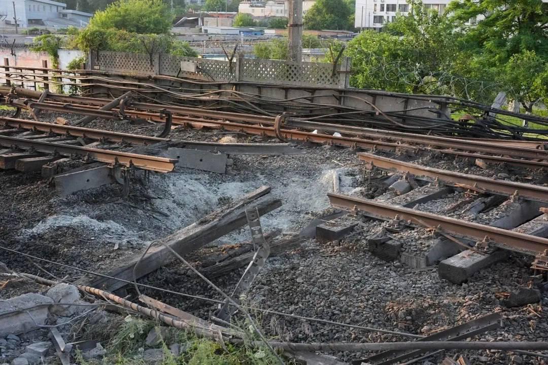 08:37 Фото зруйнованої будівлі та пошкоджених залізничних колій у Києві.