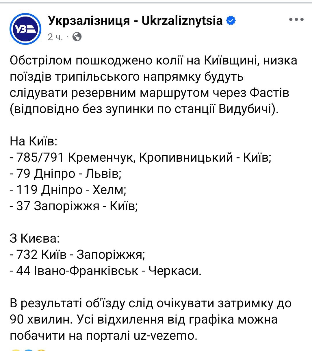 Також пошкоджено шляхи на перегоні в районі станції Видубичі, що викликало зміни у маршрутах низки поїздів Трипільського спрямування. Склади прямують до об'їзду через Фастів без зупинки на Видубичах.