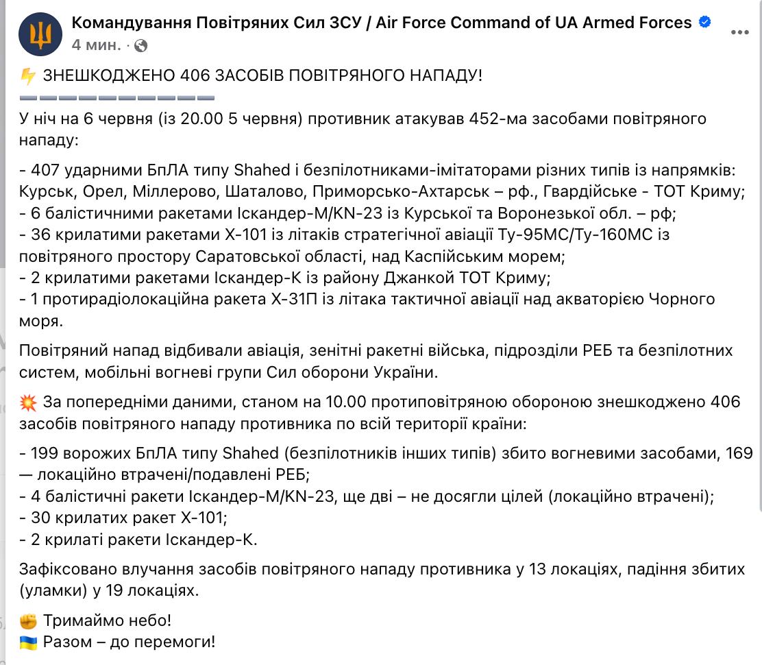 Також було запущено 407 безпілотників, з яких 199 було збито, а ще 169 придушено або втрачено внаслідок роботи засобів радіоелектронної боротьби.