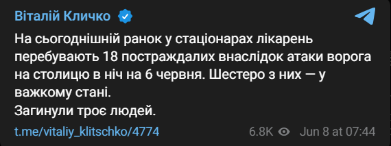 08:00 На сьогоднішній день у стаціонарах лікарень перебувають 18 постраждалих внаслідок атаки РФ на Київ у ніч на 6 червня, повідомив мер столиці Віталій Кличко.