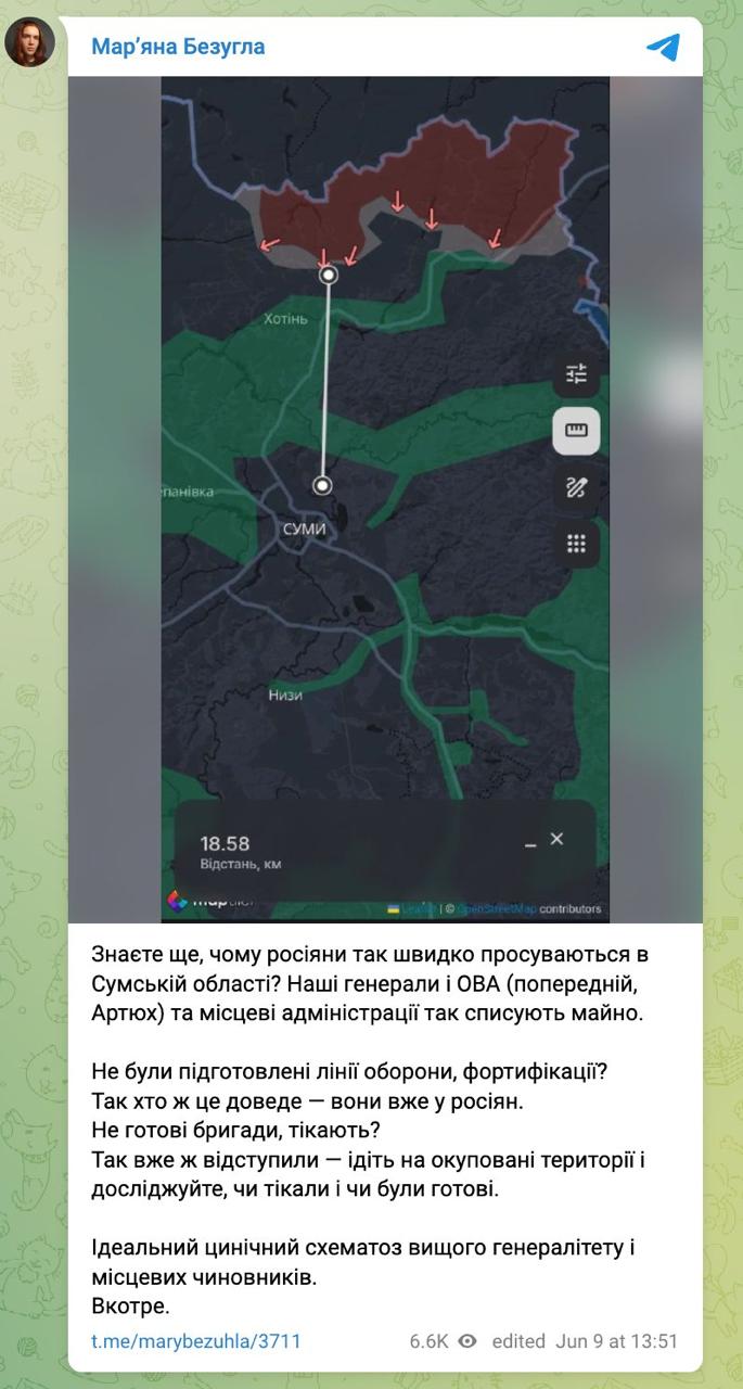 14.29 Нардеп Мар'яна Безугла натякає, що території Сумської області "здають" росіянам, щоб прикрити погану підготовку до оборони.