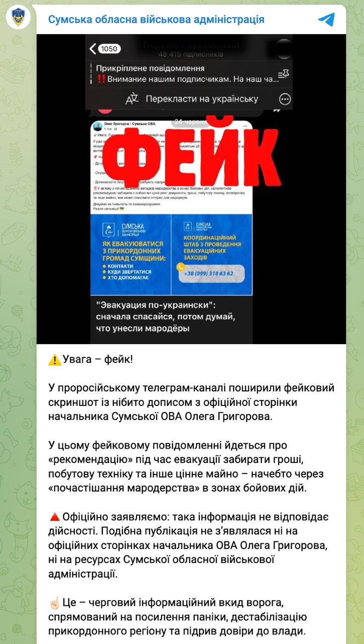 "Офіційно заявляємо: така інформація не відповідає дійсності. Подібна публікація не з'являлася ні на офіційних сторінках начальника ОДА Олега Григорова, ні на ресурсах Сумської обласної військової адміністрації. Це чергове інформаційне вкидання ворога, спрямоване на посилення паніки, дестабілізацію прикордонного регіону та підрив довіри до влади".