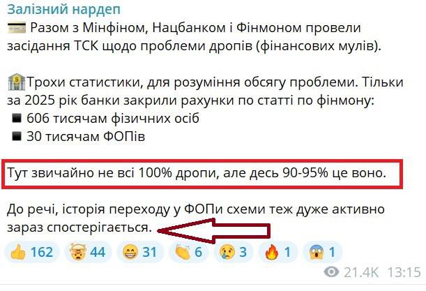 Ще один цікавий момент у повідомленні Ярослава Железняка – це його уточнення про те, що не всі 100% осіб із примусово закритими рахунками є дропами, а лише 90-95% людей.