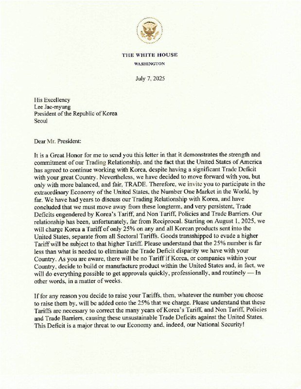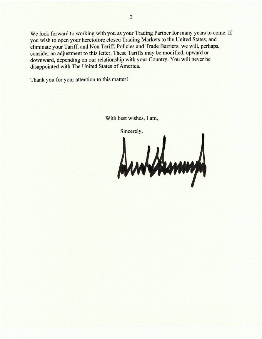 "Ми повинні покласти край торговим дефіцитам, викликаним тарифними і нетарифними бар'єрами цих країн... Тому ми вводимо 25%-ве мито на будь-які товари, що надходять", - йдеться в листах.