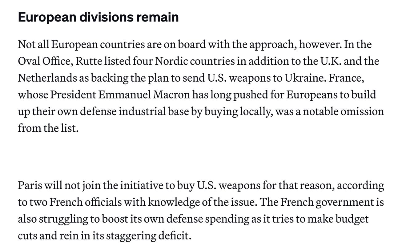 Але "Франція, президент якої давно наполягає на тому, щоб європейці нарощували свою власну оборонно-промислову базу шляхом закупівель на місцевому ринку, була помітним недоглядом у списку (охочих фінансувати американські постачання – Ред.)".
