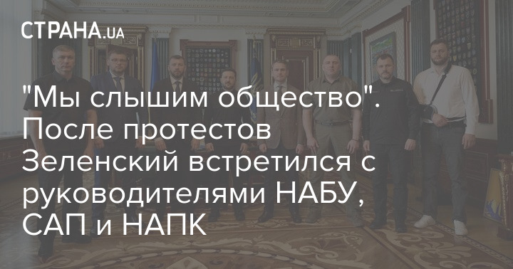 Президент України Володимир Зеленський після вчорашніх протестів зустрівся з керівниками антикорупційних структур – НАБУ, САП та НАЗК. При цьому на зустрічі також були присутні керівники СБУ, ДБР, МВС та Генпрокуратури.